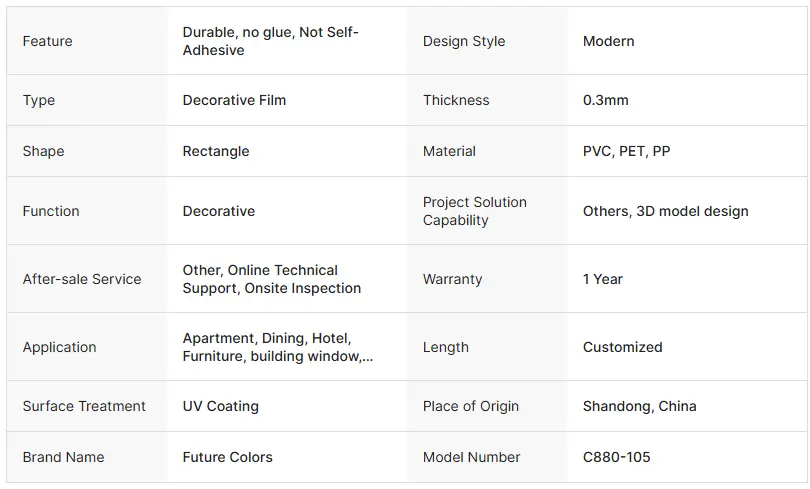 Sodobni trdni barvni pretisni film je dekorativni filmski material, ki kot osnovni material uporablja visoko molekularno plastiko. Po obdelavi barvanja in premaza doseže oprijem s "postopkom pretiha" (vakuumsko adsorpcijsko oblikovanje). Odlikuje ga "enakomerna barva, močna plastičnost in visoko stroškovno učinkovitost" in se pogosto uporablja na poljih, kot so pohištvo, dekoracija in embalaža. Je eden od najpogosteje uporabljenih materialov v sodobnem minimalističnem slogu.